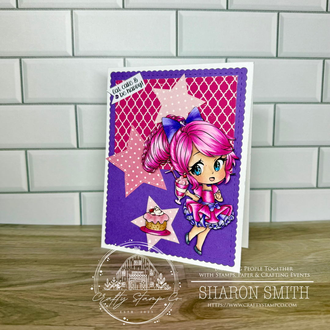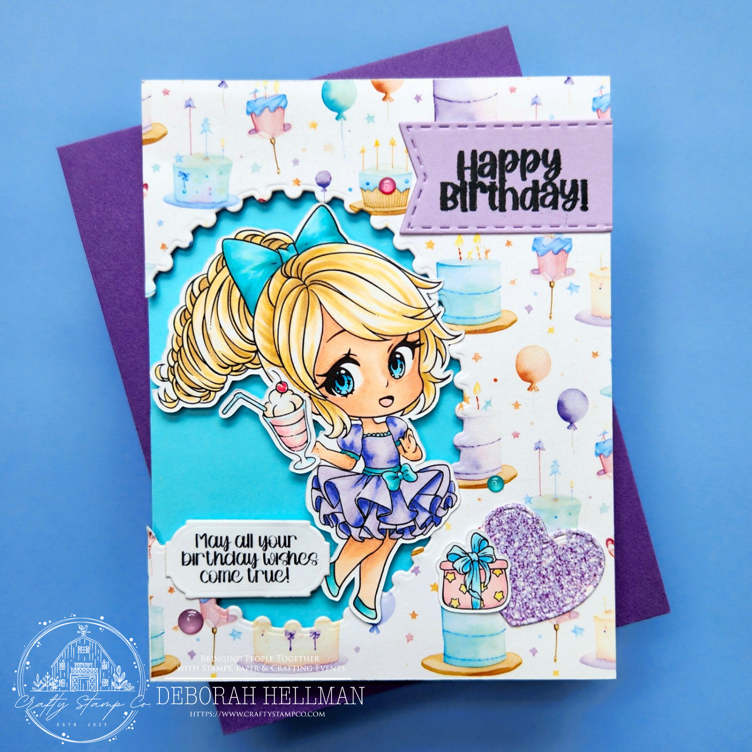DESCRIPTION: (1) meadow in a party dress image, (1) cake image, (1) plate/platter image, (1)ice cream sundae/milkshake image, (4) sentiments